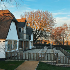 The pavilion itself is a striking example of late Arts and Crafts design, a style known for its picturesque qualities and craftsmanship. Its deep thatched roof sweeps low over the eaves, with stone mullioned windows and gabled cross-wings that form a finely proportioned, elegant silhouette. These architectural elements make it a building of considerable merit, admired for both its beauty and its thoughtful design.